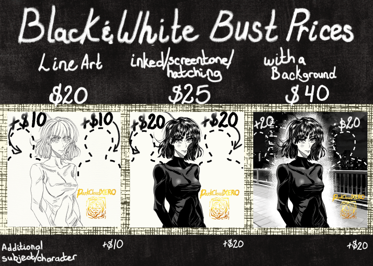 B/W Full Body inked/screentone/hatching with a Background – $50