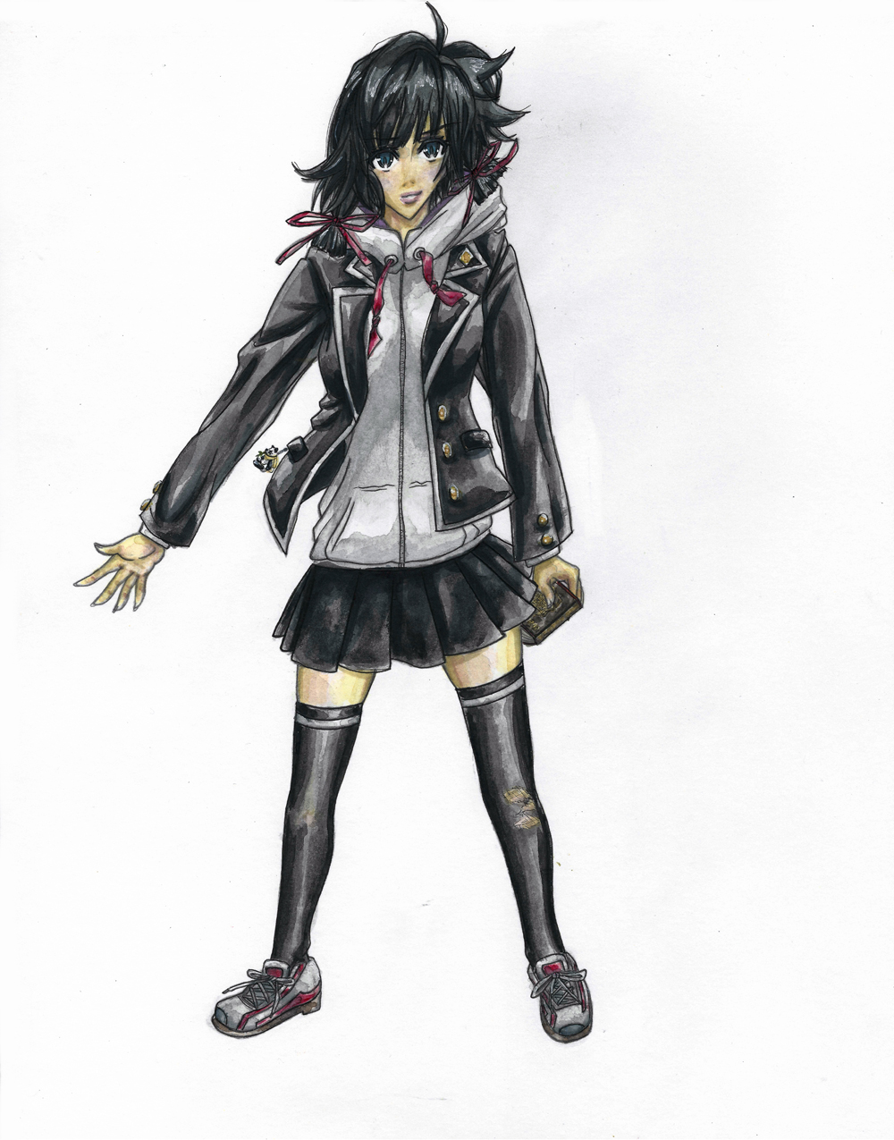 For the character I noticed that they both used dark uniforms so I tried to blend some elements from both (can you find them?). I added a couple of details that showmark some of their interests and special skills. Also since Kamijou is known for his MISFORTUNE, I have Yukinoshita Touma with scraped knee socks. Both are very sure of themselves but not cocky. So I wanted a very serene and reassuring gaze coming from her (my character). The hair was something I really had to think about. I wanted Touma’s spiky hair, but since it is a girl I also wanted the silky hair of Yukino. So I went with a combination of both that makes her both really cute and like a bit of a tomboy that can get into action at any time.