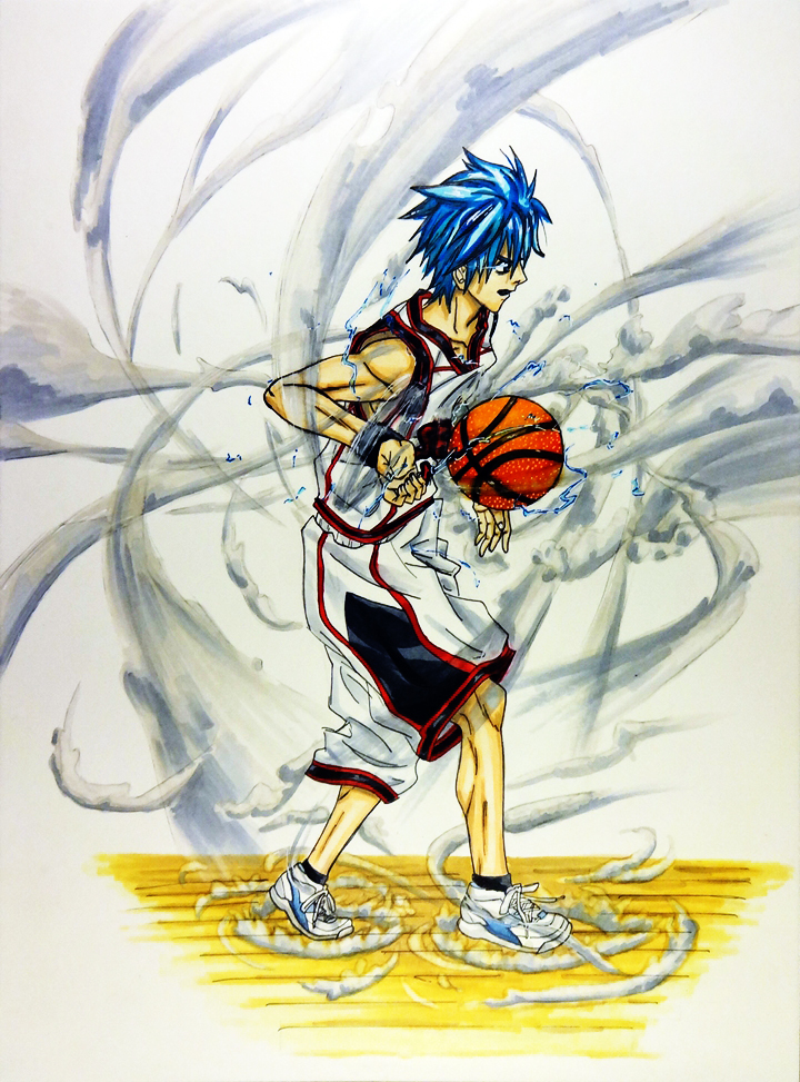 So this weeks artwork will be featuring Kuroko Tetsuya from the Kuroko no Baske (“the basketball Kuroko plays”), a series that is much like Captain Tsubasa (except instead of Football, they play basketball). This means that there will be young school players that have extraordinary techniques that makes one think of Dragon Ball (minus the fighting). It is an amazing series and has the type of characters I like as a protagonist (the main one anyway), a weak player in all areas except passing. This means that he has a lot to improve throughout the series. And sure enough, the series delivers. Despite his weaknesses, Kuroko uses his strengths to make his lack of abilities more than make up for it. I don’t want to delve too much into it, so if you have not seen it, make sure to do so as soon as you can.