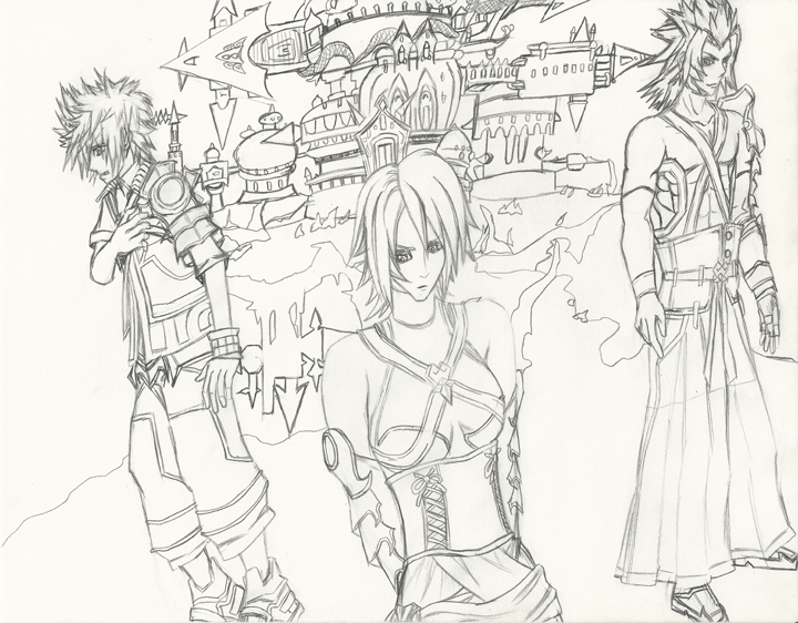 Once I had it all in order I darkened a couple of colors and areas using that carbon pencil I was talking about. After that I noticed that I would be able to produce an effect I was thinking about when it came to Ventus and specially Terra. I wanted to show that darkness was present in both, though it engulfed Terra so I added some black aura/shadows/mist around their bodies. But I also wanted Aqua to remain untouched by it but still in the midst of it since they are her friends and also her responsibility. I’ll talk a bit more about what I wanted to convey through this drawing a bit later. One thing I wasn’t really sure about was Ventus’s hair. I just didn’t like the dark outline at all. So I decided to add a bit of white highlights with my white pen. Luckily it came out rather well. So before I explain anything about it, here are the pictures.